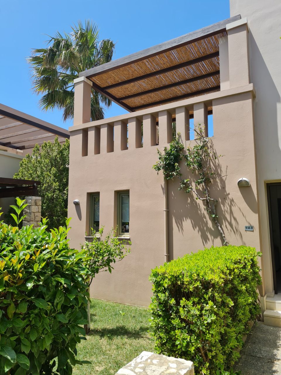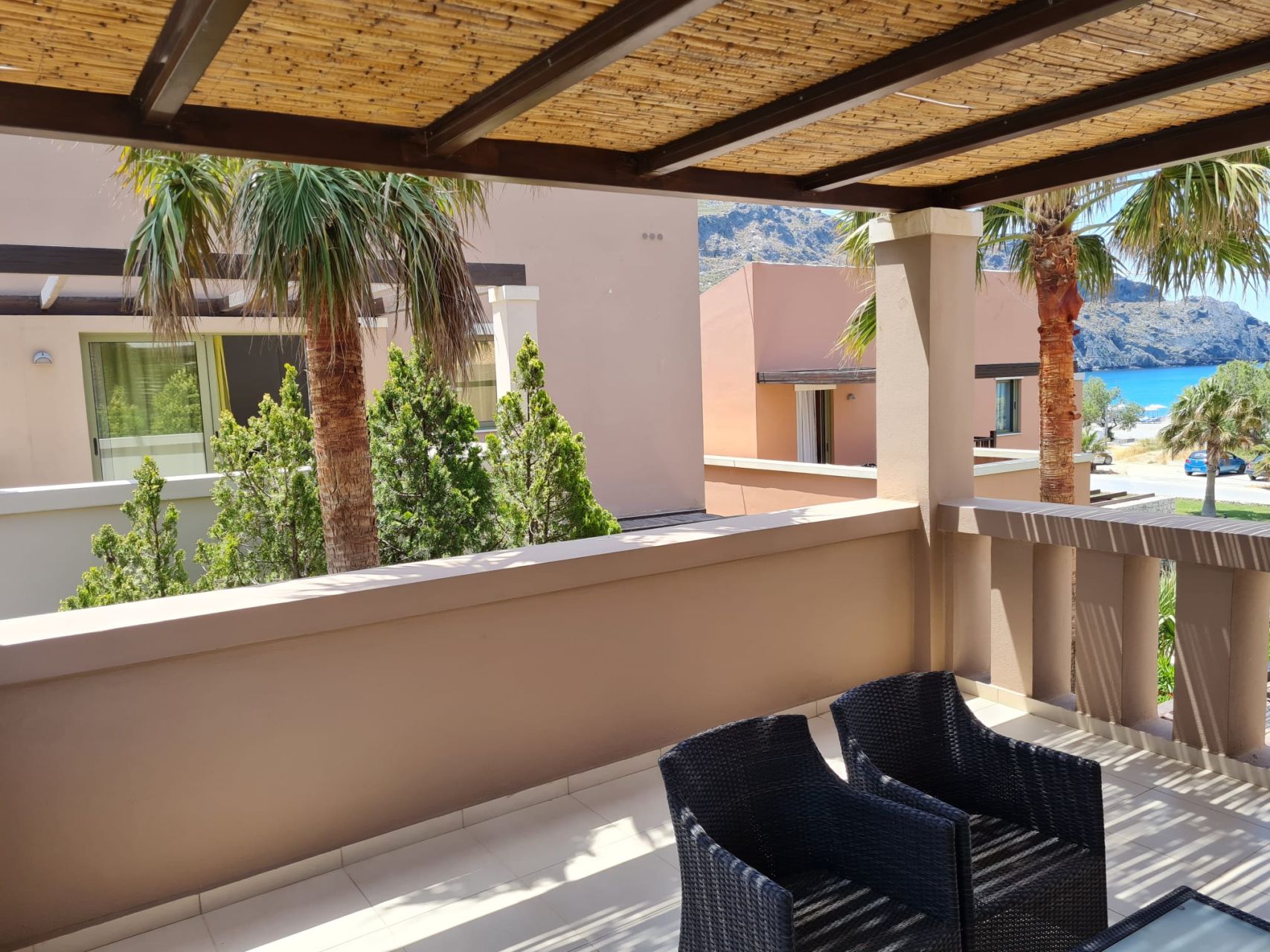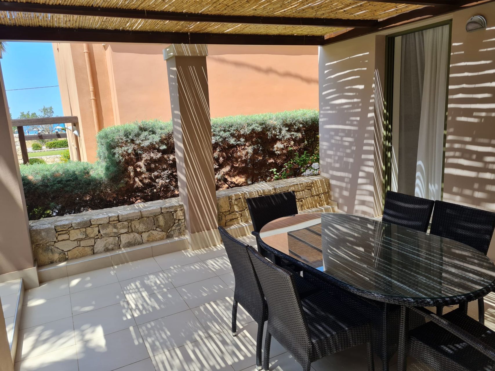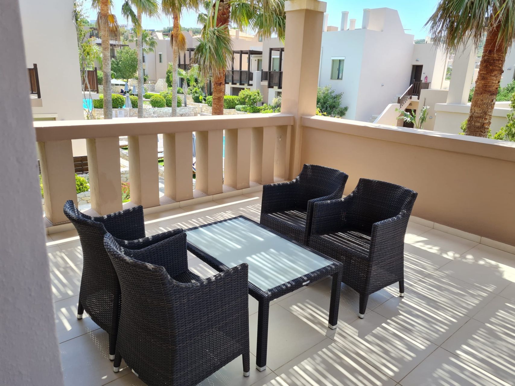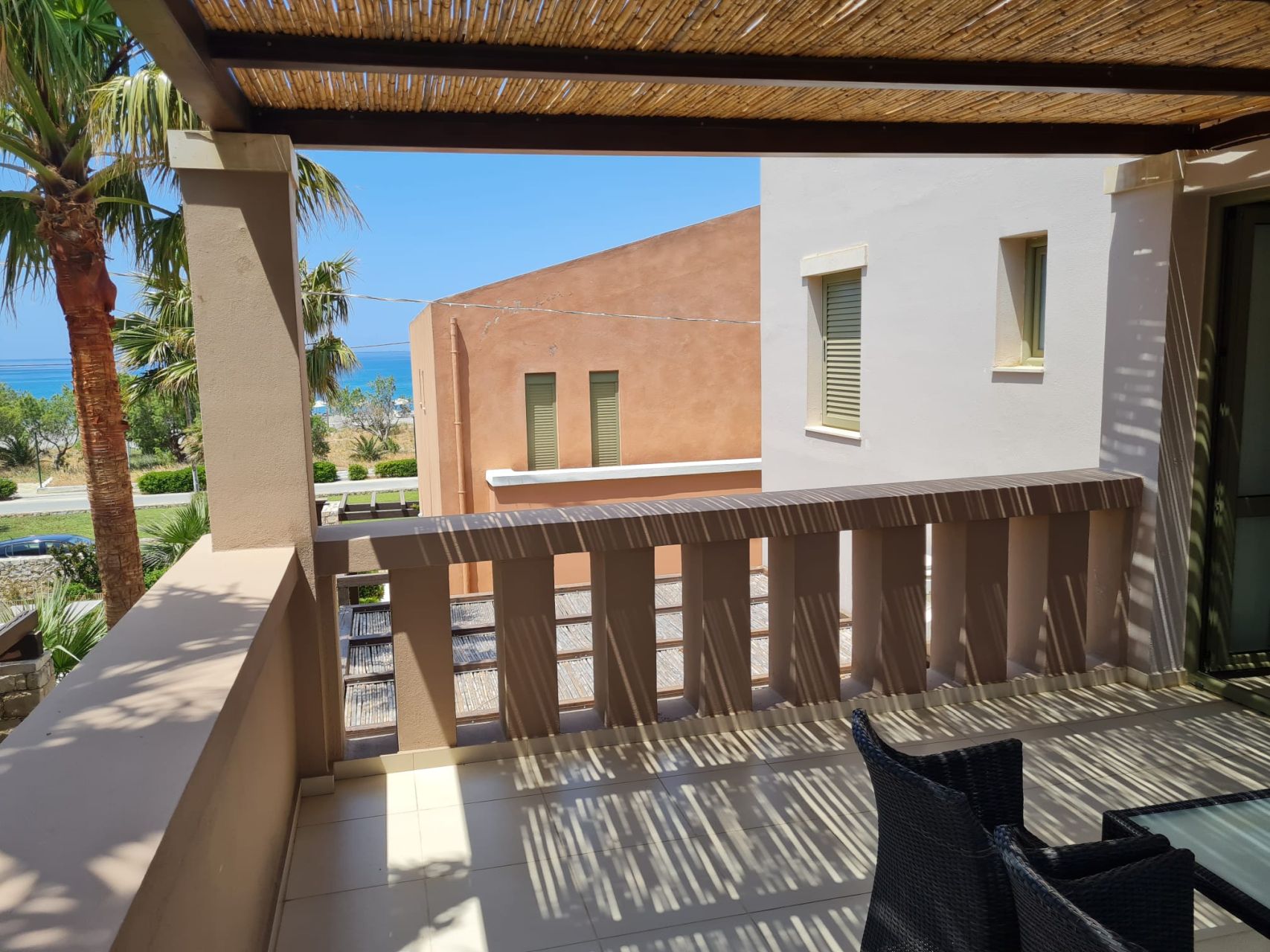 Όλα τα δωμάτια είναι φωτεινά, κλιματιζόμενα και διαθέτουν μεγάλη εντοιχισμένη ντουλάπα. Στον 1ο όροφο υπάρχει επίσης ένα μεγάλο μπαλκόνι, το οποίο προσφέρει πολύ ωραία θέα στον κήπο του συγκροτήματος καθώς και στη θάλασσα. Το διαμέρισμα διαθέτει δικό του χώρο στάθμευσης στο υπόγειο του συγκροτήματος.