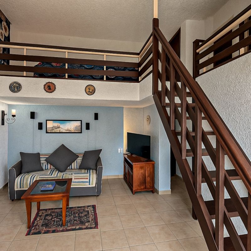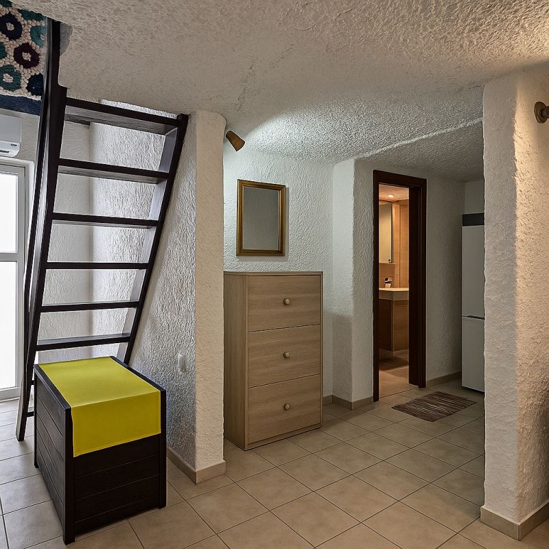 Το εσωτερικό του διαμερίσματος είναι λειτουργικά διαμορφωμένο, διαθέτοντας δύο χώρους υπνοδωματίων στο επάνω επίπεδο, ο ένας εκ των οποίων μπορεί να λειτουργήσει και ως καθιστικό, καθώς και έναν ενιαίο χώρο με τραπεζαρία και κουζίνα. Το μπάνιο έχει ανακαινιστεί πρόσφατα και περιλαμβάνει μπανιέρα, ενώ υπάρχει επιπλέον αποθηκευτικός χώρος για την κάλυψη καθημερινών αναγκών.