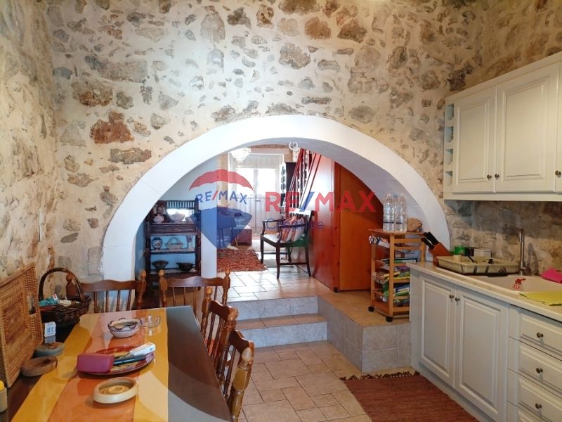 Στο ισόγειο της κατοικίας, φιλοξενείται ένας ενιαίος χώρος σαλονοκουζίνας με παραδοσιακά στοιχεία, όπως τζάκι, ξύλινες δοκοί και καμάρες, που διατηρούν το ύφος της κρητικής αρχιτεκτονικής. Στο ίδιο επίπεδο βρίσκεται και ένα μικρό WC.