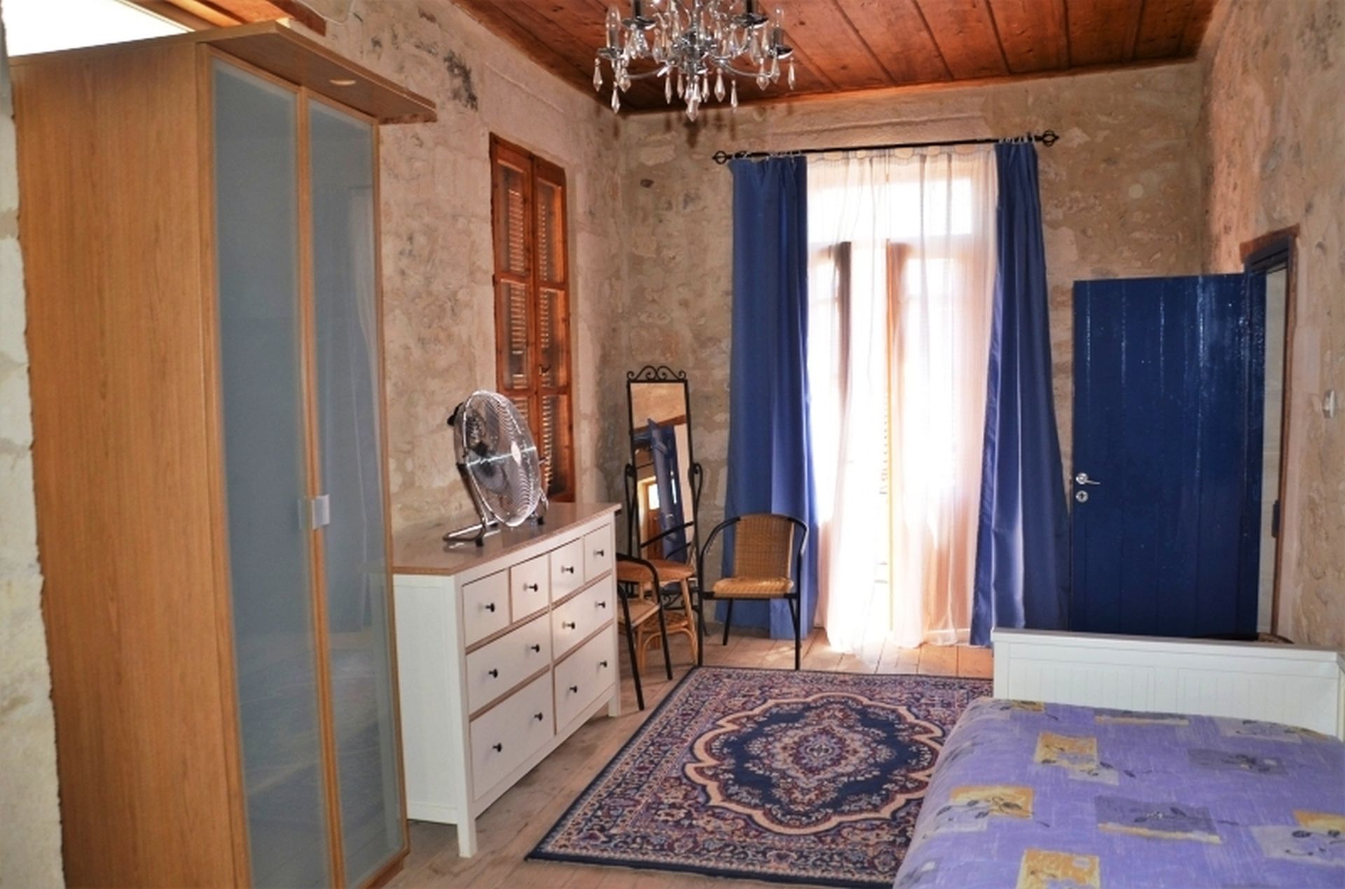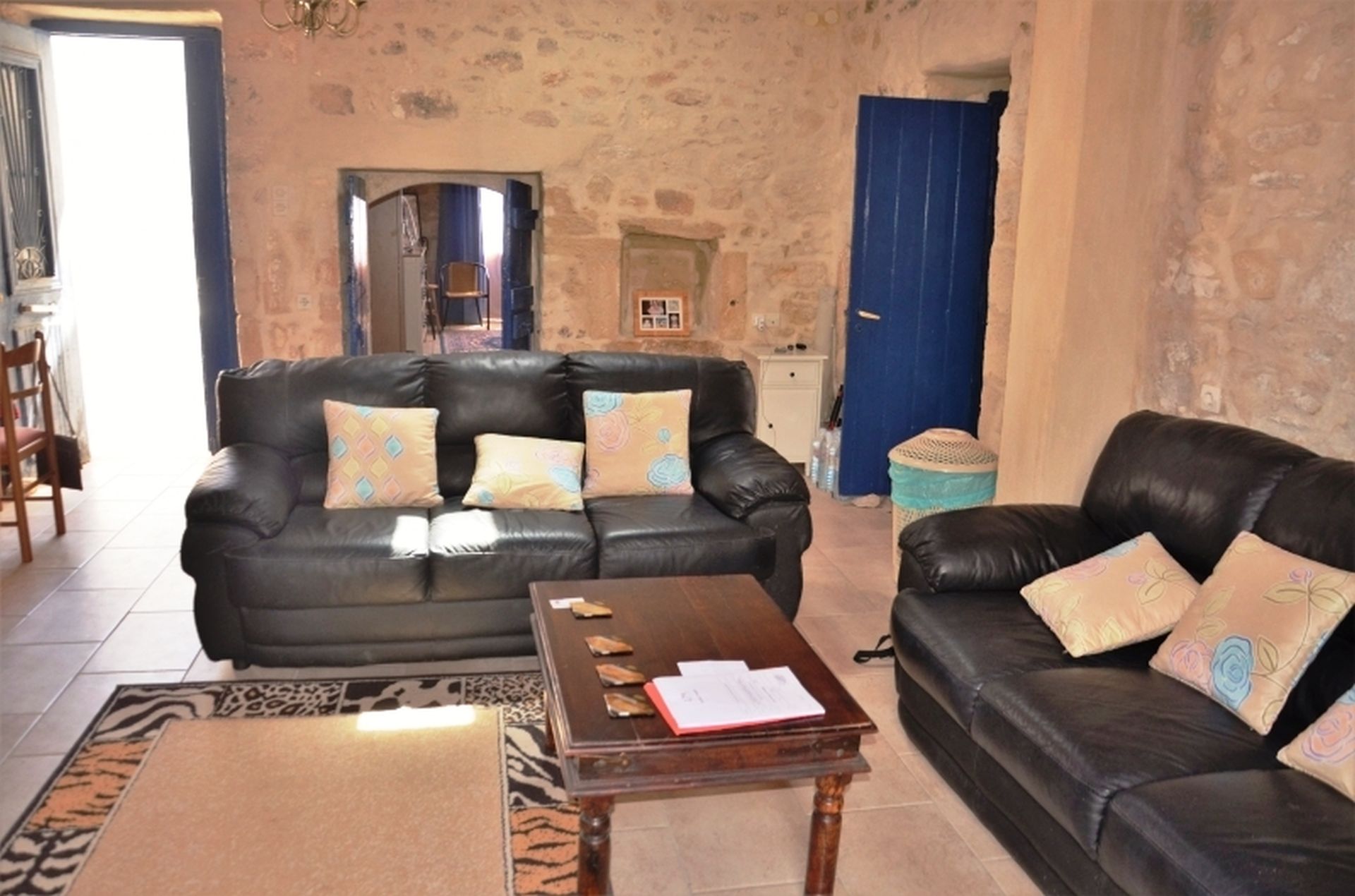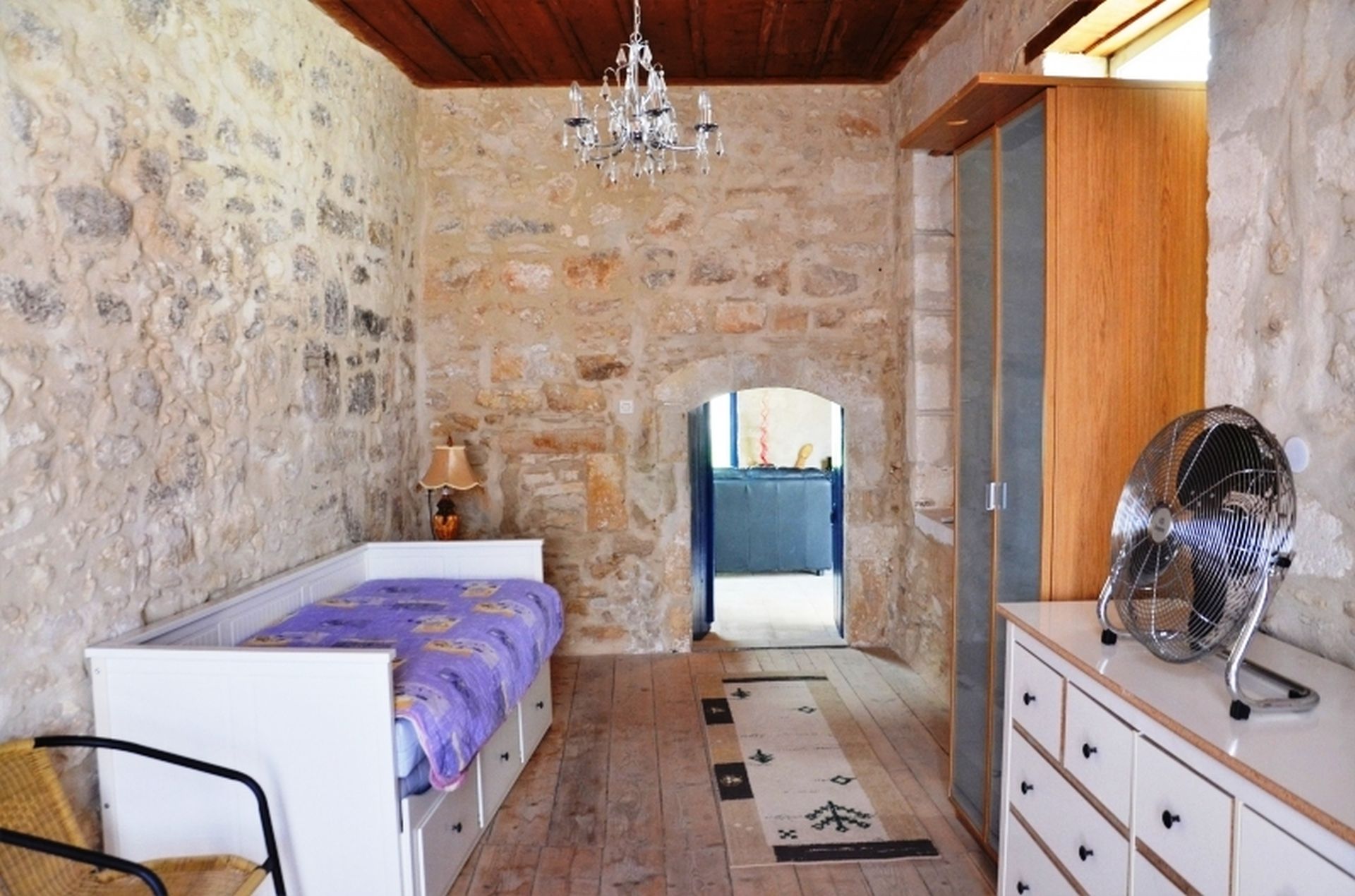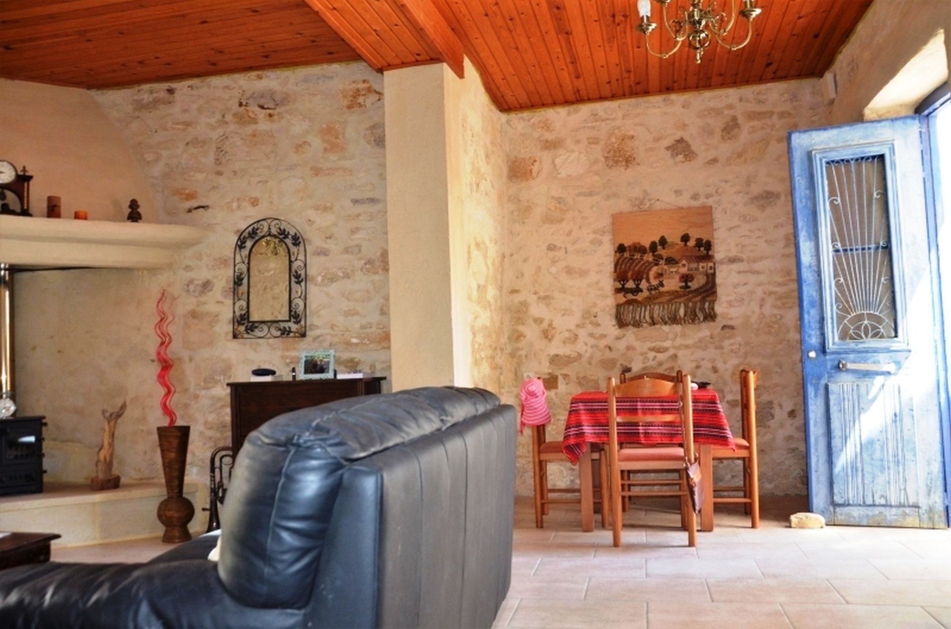 Ανεβαίνοντας στον πρώτο όροφο, συναντάμε έναν ενιαίο χώρο, όπου υπάρχει το σαλόνι και η τραπεζαρία με ένα όμορφο και μεγάλο τζάκι. Στη συνέχεια προχωρώντας προς το εσωτερικό της οικίας βρίσκονται τα δύο υπνοδωμάτια, το ένα εκ των οποίων διαθέτει μπαλκόνι το οποίο βλέπει στον κεντρικό δρόμο του χωριού ενώ το δεύτερο έχει πρόσβαση σε βεράντα.