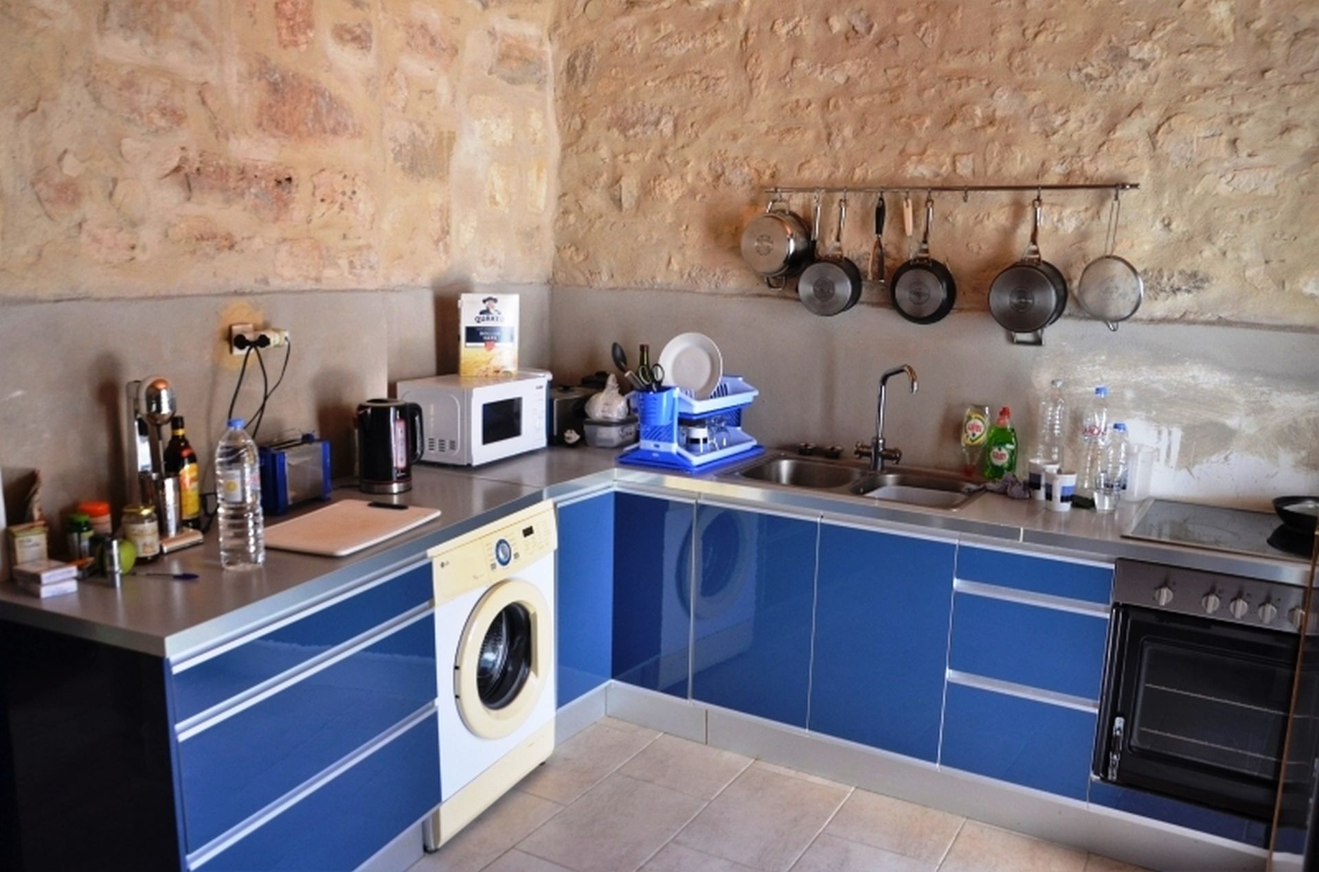 Συνεχίζοντας προς το εσωτερικό του σπιτιού συναντάμε μία ευρύχωρη κουζίνα που επικοινωνεί με την μεγάλη βεράντα της οικίας, καθώς και το μπάνιο.