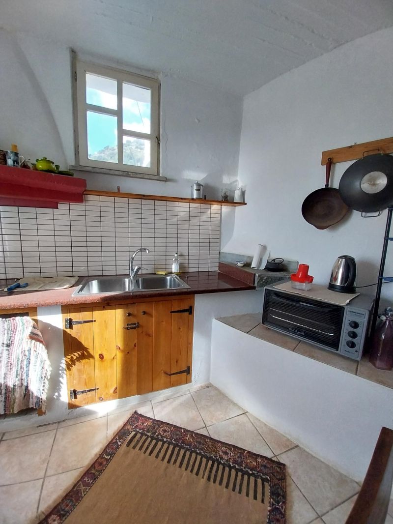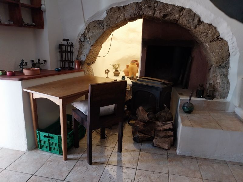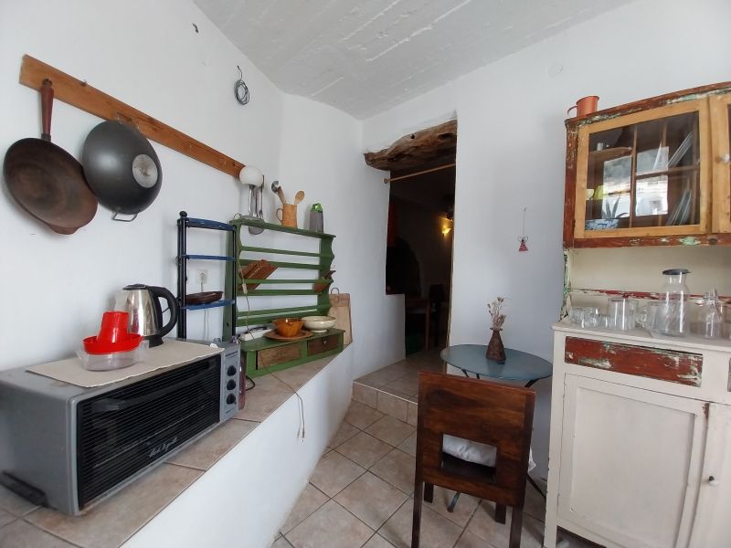 Η είσοδος οδηγεί απευθείας στην κουζίνα, όπου χτιστά χωρίσματα διαμορφώνουν ανοιχτά ντουλάπια και πάγκους εργασίας, διατηρώντας το παραδοσιακό ύφος. Δίπλα σε μια εσοχή με καμάρα βρίσκεται ένας άνετος χώρος τραπεζαρίας/καθιστικού, δημιουργώντας μια ζεστή και φιλόξενη ατμόσφαιρα.