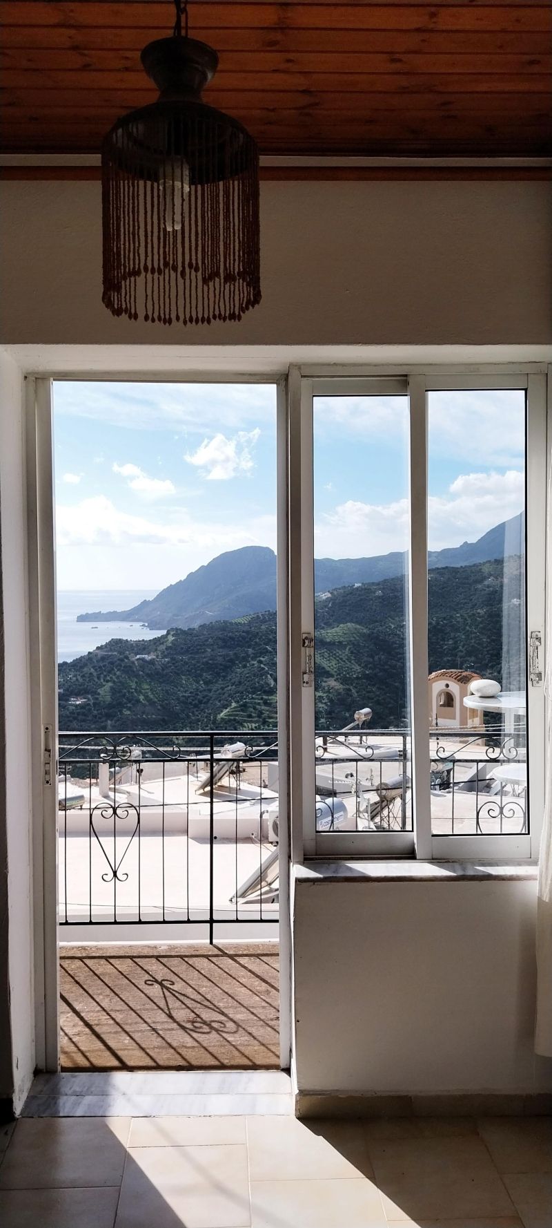 Μια συρόμενη πόρτα ανοίγει σε μικρό μπαλκόνι με θέα στο χωριό και στα μαγευτικά ηλιοβασιλέματα πάνω από την ακτογραμμή, καθώς και προς το χωριό Σελλιά το οποίο βρίσκεται απέναντι.