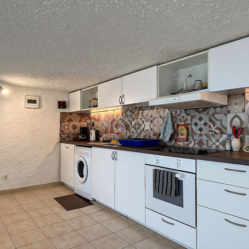 Η κουζίνα είναι εξοπλισμένη με σύγχρονα έπιπλα και ηλεκτρικές συσκευές, προσφέροντας άνετους πάγκους και επαρκής χώρους αποθήκευσης.