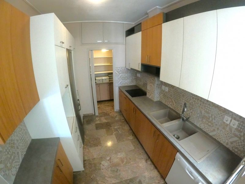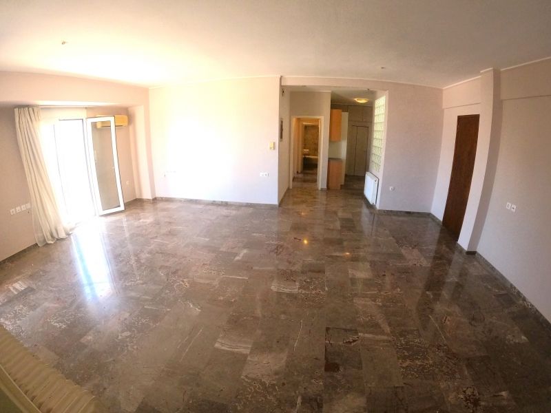 Το διαμέρισμα διαθέτει έναν ευρύχωρο και φωτεινό ενιαίο χώρο, ο οποίος περιλαμβάνει το σαλόνι και την τραπεζαρία. Στον ίδιο χώρο βρίσκεται η μία από τις δύο κουζίνες, η οποία προσφέρει επιπλέον ένα δωμάτιο που μπορεί να χρησιμοποιηθεί ως αποθηκευτικός χώρος.
